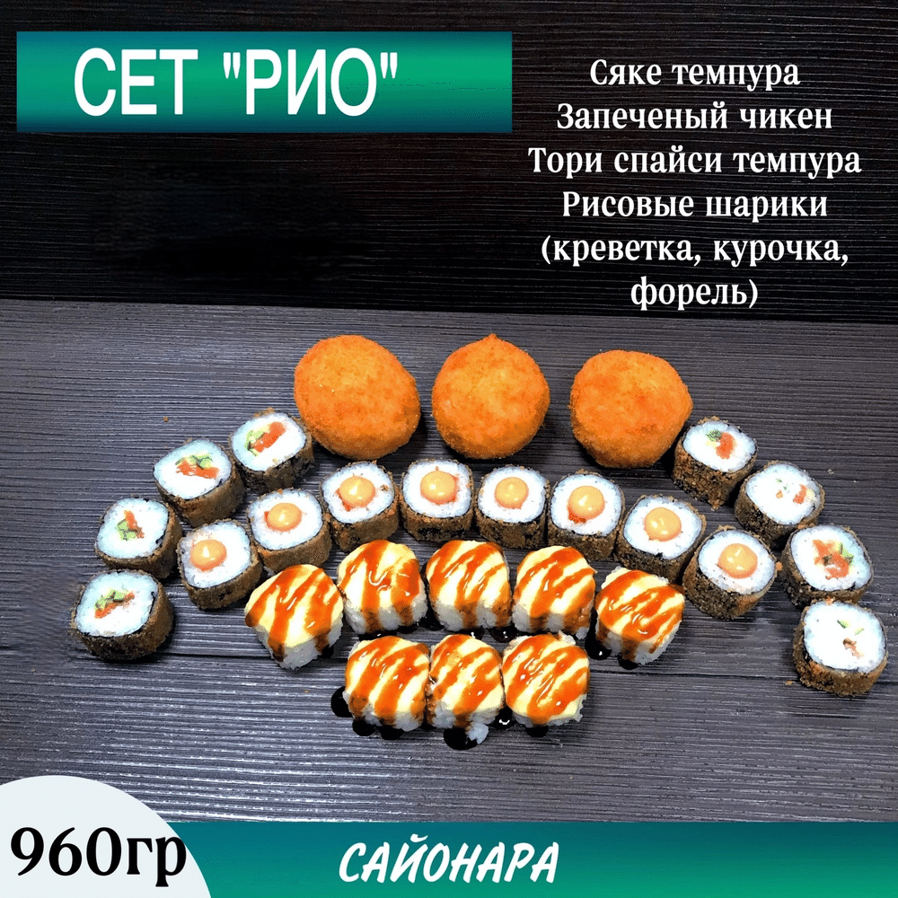 Рисовый шарик, ролл «Сяке темпура», ролл «Тори спайси темпура», ролл запеченный «Чикен»