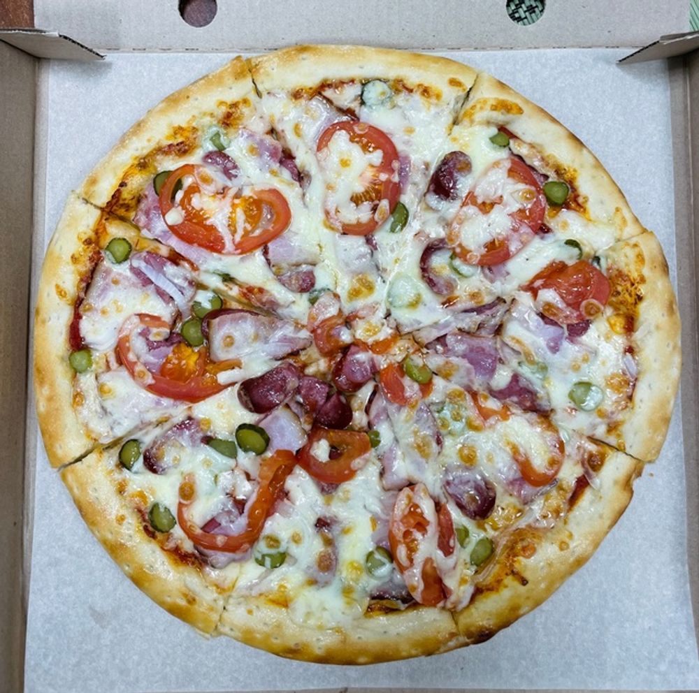 Фирменная томатная основа, моцарелла, копченые колбаски, бекон, корнишоны, томаты, лук