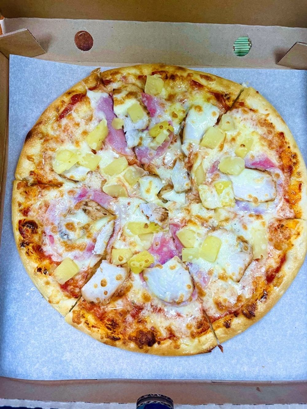 Фирменная томатная основа, моцарелла, ветчина, курица жаренная, ананасы