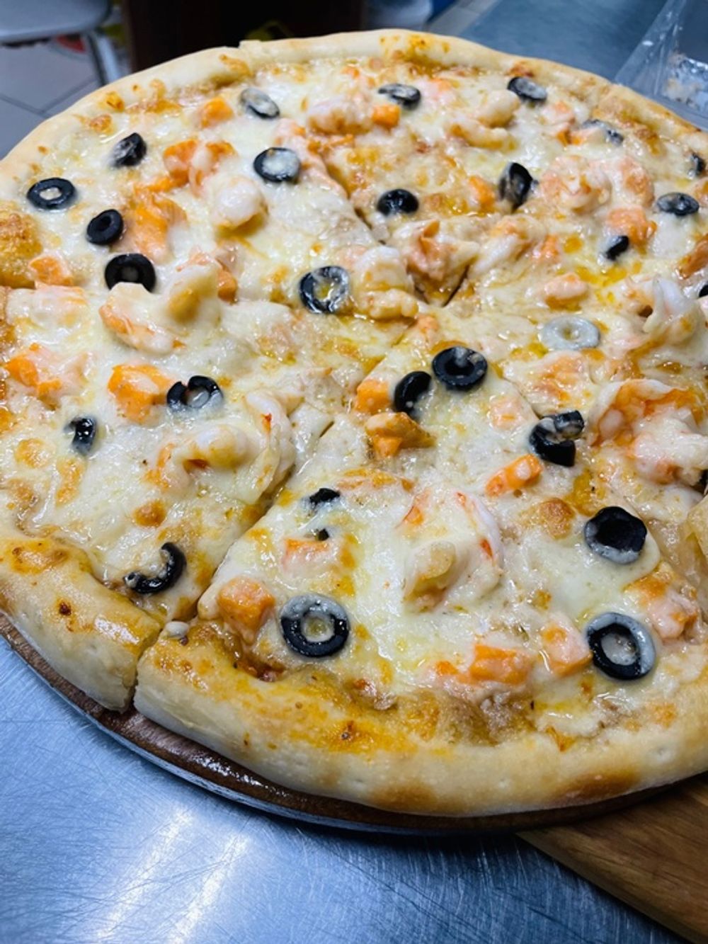 Фирменный соус, моцарелла, креветки, форель, маслины, томаты