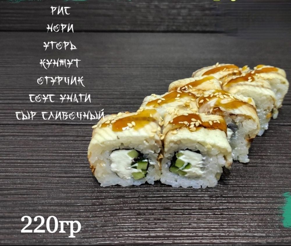 Рис, нори, угорь, сыр сливочный, огурец, соус унаги