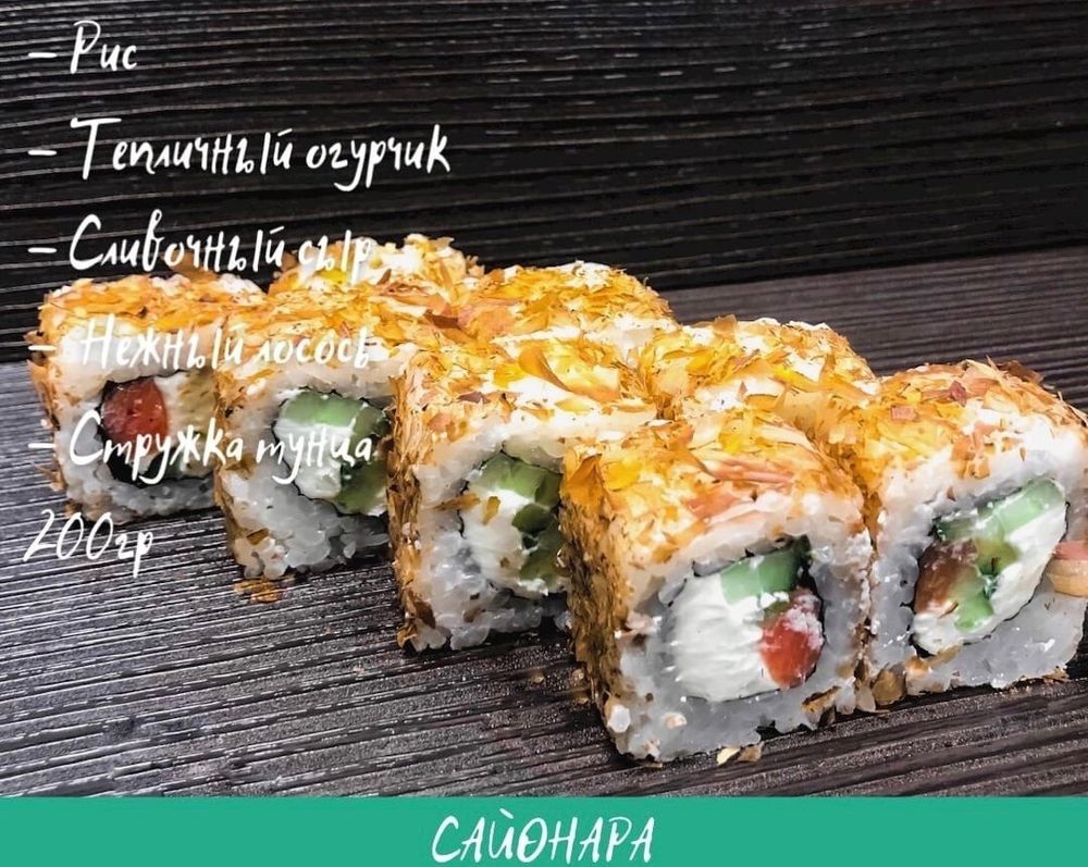 Рис, нори, форель, сыр сливочный, огурчик, стружка тунца