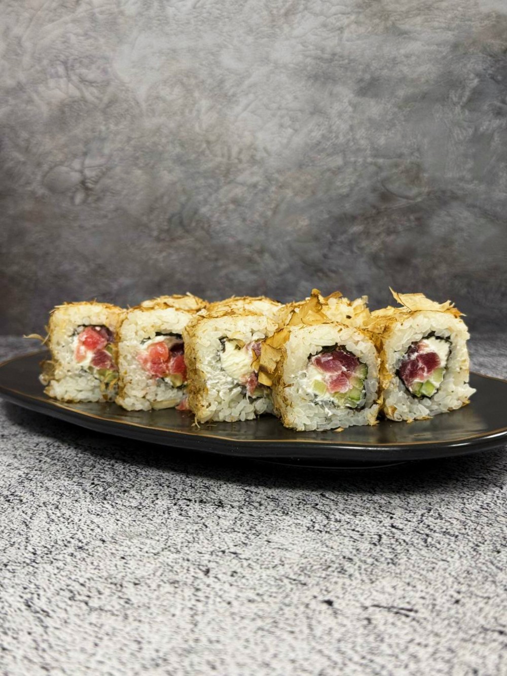 Рис, нори, сыр творожный, тунец, огурец, стружка тунца