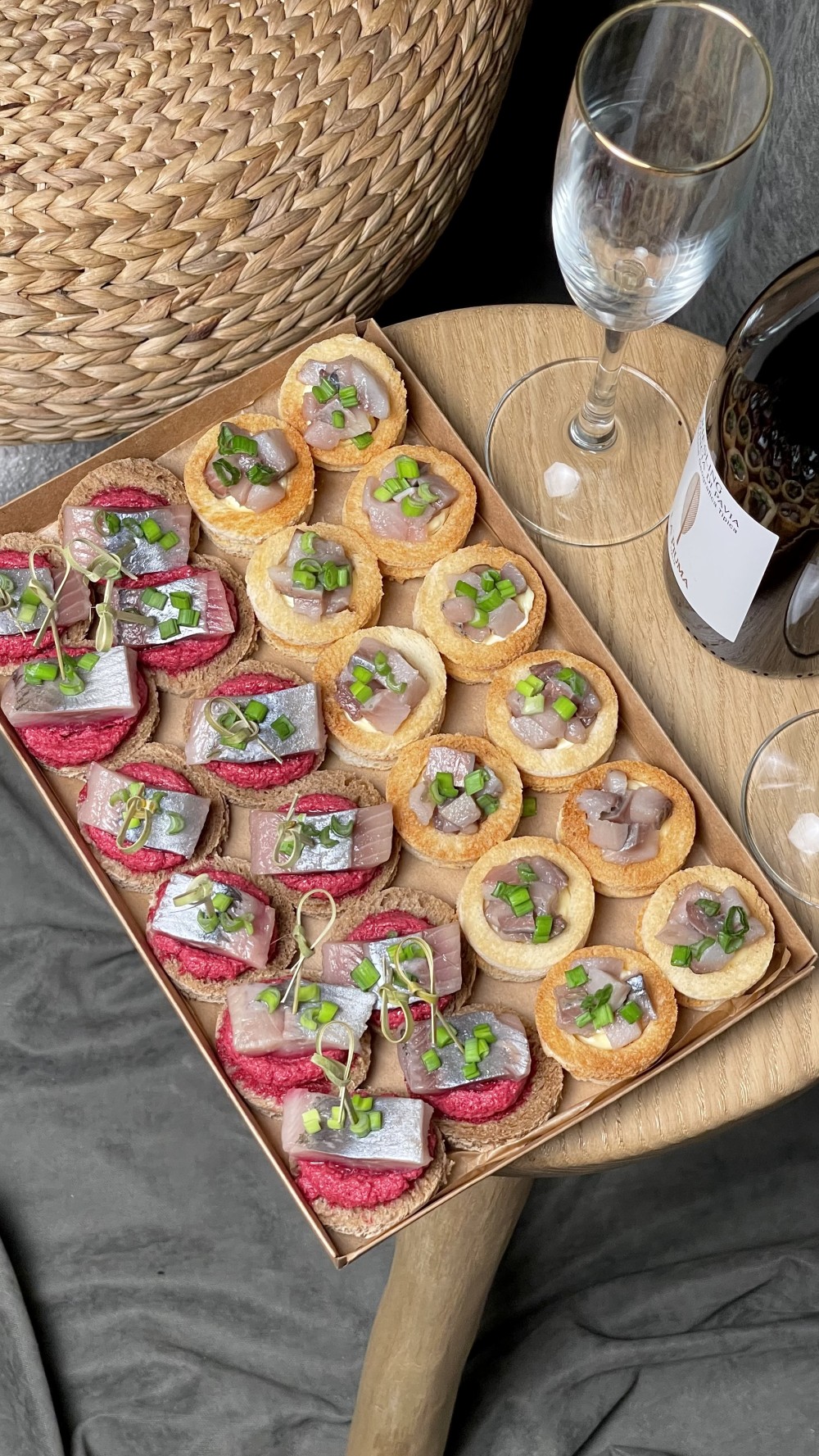 Только по предзаказу, за 2 дня и более до мероприятия. В гастробокс входит 24 закуски: -Тарталетки со сливочным маслом, сельдью и луком 12шт -Канапе с сельдью и муссом из свеклы 12шт