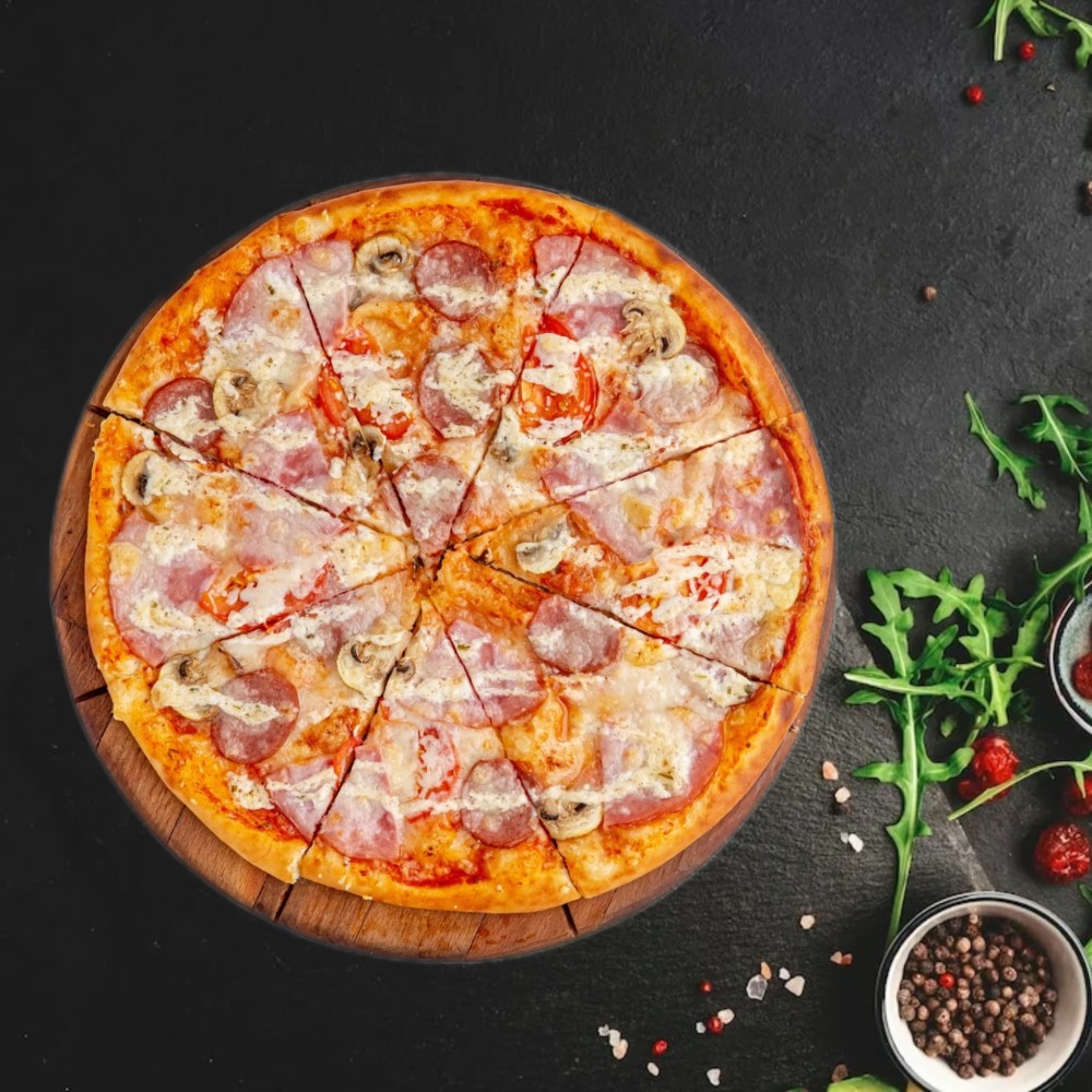 Фирменная томатная основа, сыр моцарелла, ветчина, охотничьи колбаски, шампиньоны, томаты, польем чесночным соусом по желанию.