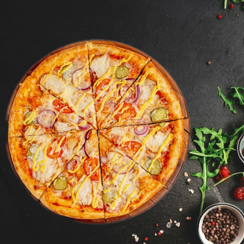 Фирменная томатная основа, сыр моцарелла, сервелат, жаренная курица, лук, корнишоны, томаты, польем сырным соусом по желанию.