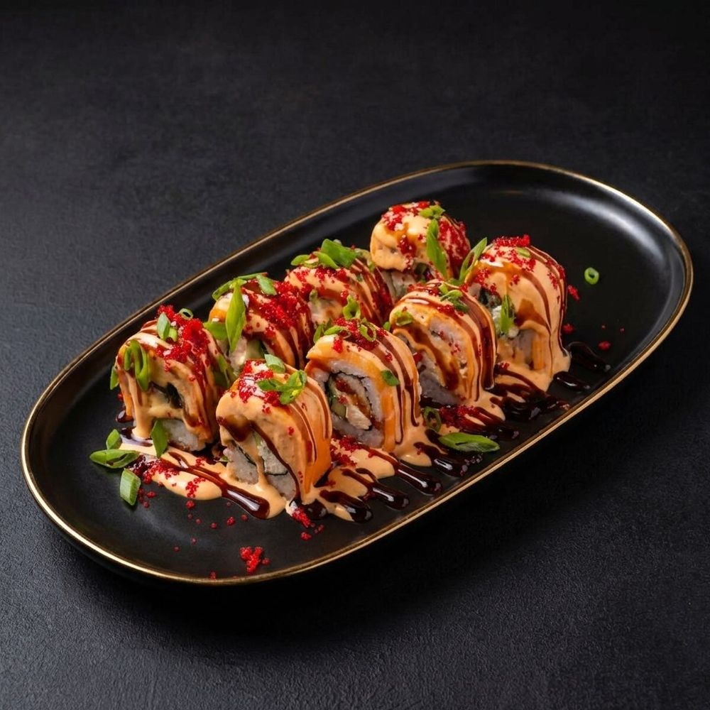 Рис, нори, сыр cremette, креветка, огурец, форель с/с (запекается), спайси соус, унаги соус, лук зеленый, масага.