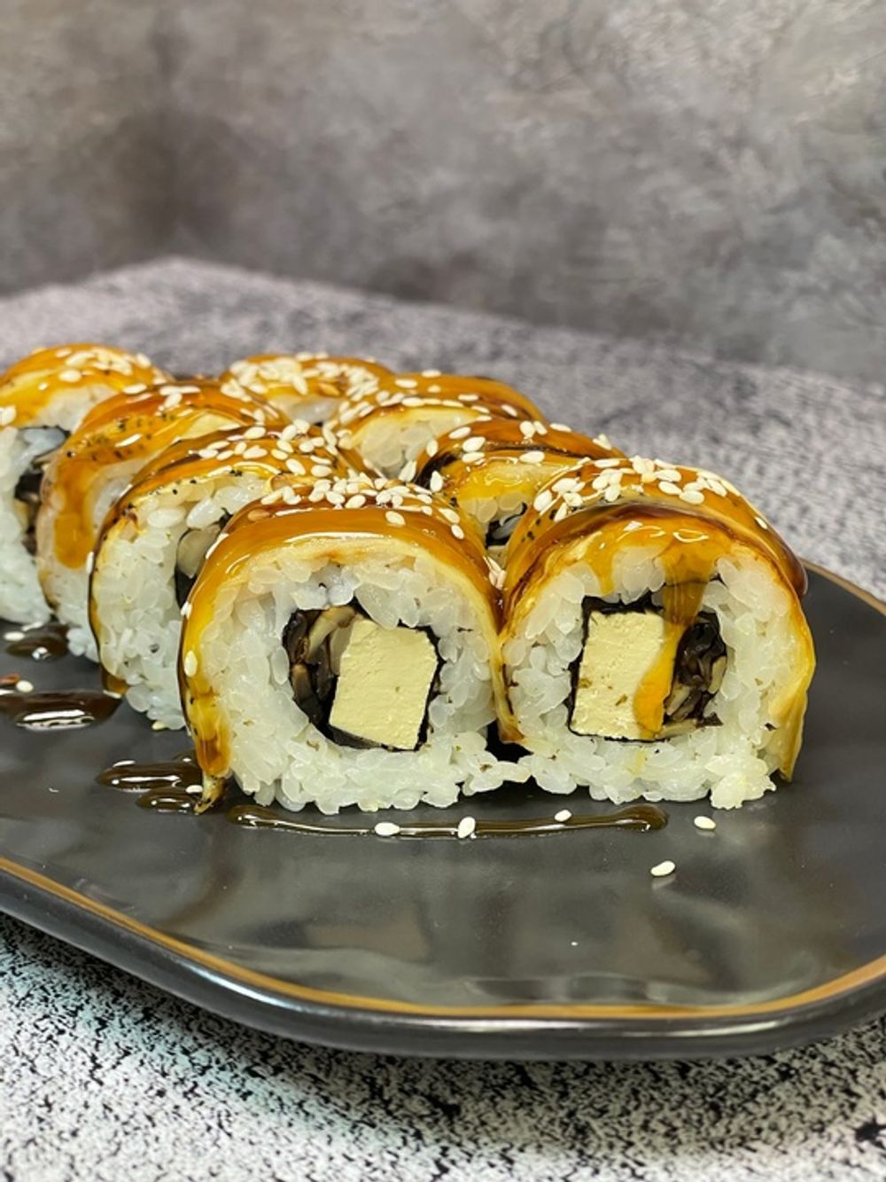 Рис, нори, тофу, шампиньоны жаренные, баклажан запеченный, соус терияки, кунжут