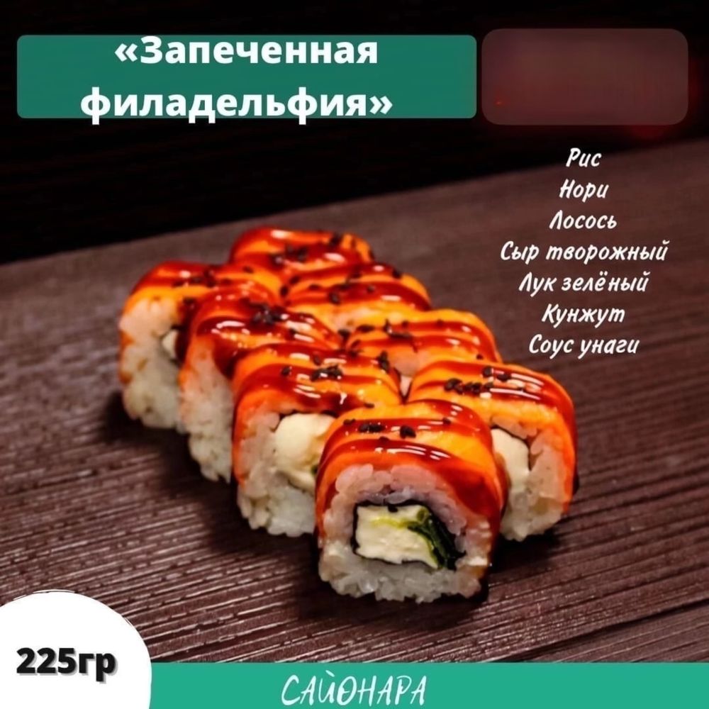 Рис, нори, форель, сыр творожный, лук зеленый, кунжут, соус унаги