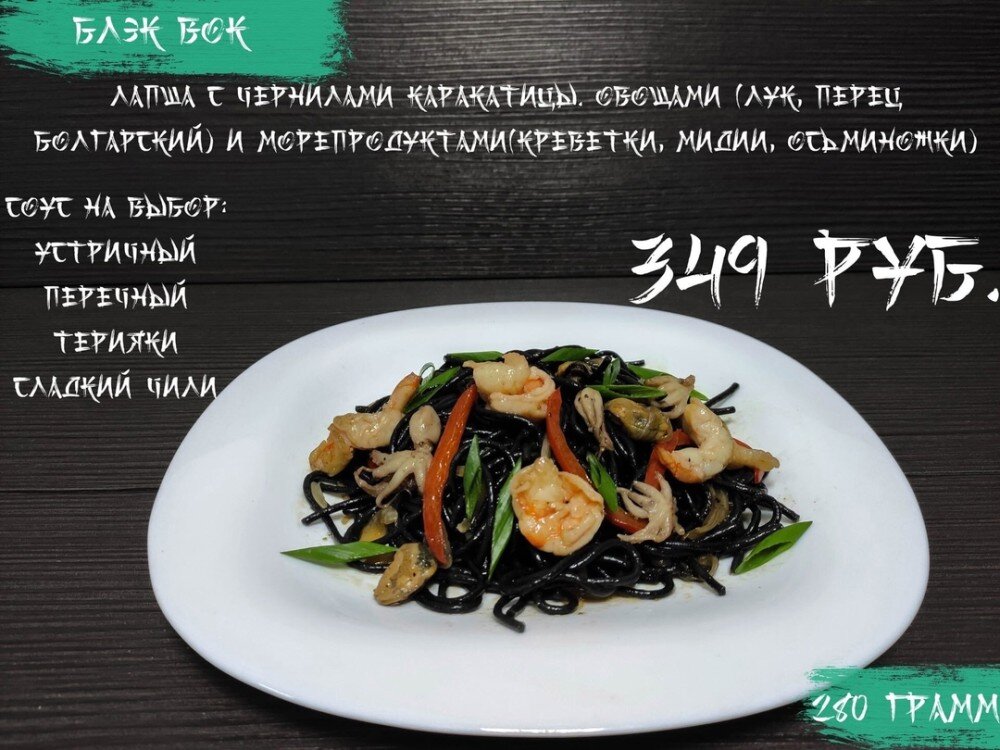 Лапша с чернилами каракатицы, овощи, морепродукты, соус на выбор